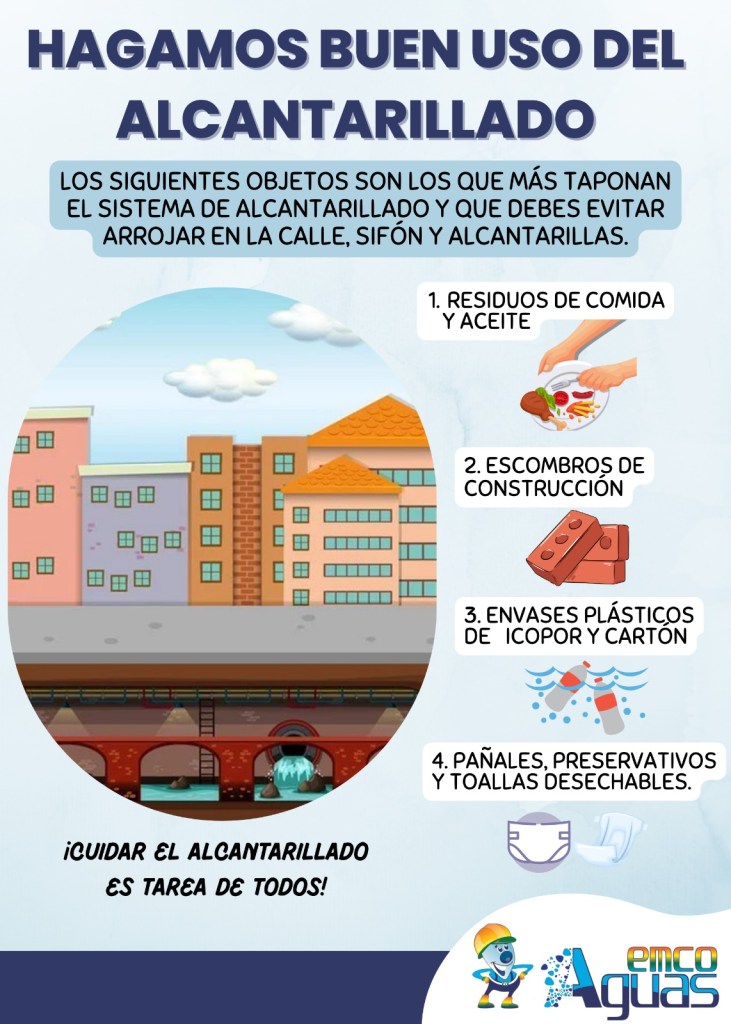 1 octubre, 2024 emcoaguaseditor Cuidemos y hagamos un uso correcto del alcantarillado 🚨Los siguientes objetos son los que más taponan la red de alcantarillado: Residuos de comida Escombros de construcción Envases plásticos de icopor y cartón Pañales y toallas desechablesEvitemos arrojar en la calle, sifón y alcantarillas. Es tarea de todos! Comparte esto: Compartir en X (Se abre en una ventana nueva) X Compartir en Facebook (Se abre en una ventana nueva) Facebook Compartir en WhatsApp (Se abre en una ventana nueva) WhatsApp Me gusta Cargando... Relacionado