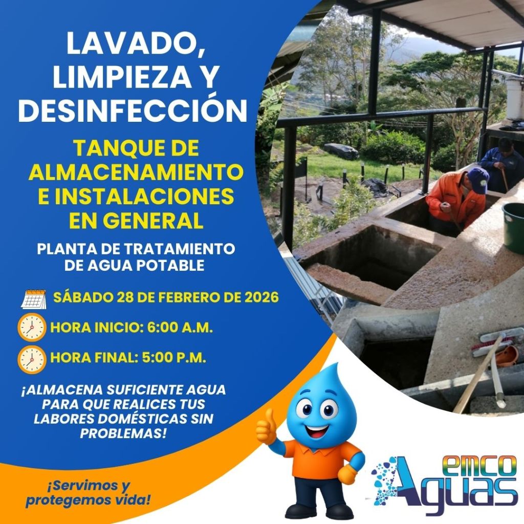 El próximo sábado 28 de febrero 🗓️ realizaremos actividades de lavado, limpieza y desinfección🧹🧼🪥🧽🫧 del tanque de almacenamiento de agua potable💧, asi como de las instalaciones de la planta de tratamiento en general, 🏗️esto para garantizar a todos nuestros usuarios un servicio de calidad. 👌🏿