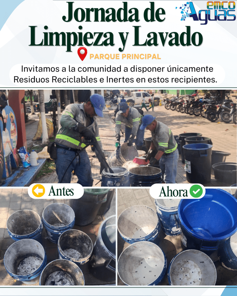Con el fin de mantener nuestros espacios públicos limpios, organizados y en buenas condiciones, se realizó el lavado de los baldes de residuos ubicados en el parque principal.